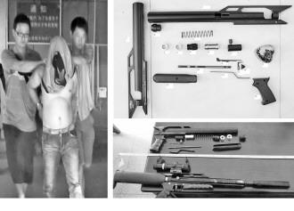 图①为嫌疑人被抓获。图②为缴获的枪支零配件。图③为用缴获配件组成的气枪。