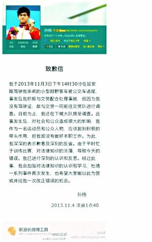 11月4日凌晨2时36分,孙杨在微博中发布致歉信,称因平时忙于训练比赛,对法律知识的淡薄,导致今天的错误,并希望大家以此为警戒给他一次改正错误的机会。