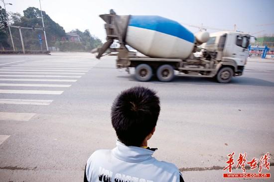 11月6日中午,长沙市芙蓉北路鹅羊山段,龙强站在事发路段马路边,一辆水泥罐车无视红灯,从血迹上呼啸而过。记者 李丹 摄