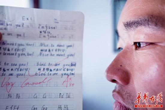 ▲11月6日中午,长沙市鹅羊山安置小区家中,龙强看着小女儿的笔记,说不出一句话。 记者 李丹 摄
