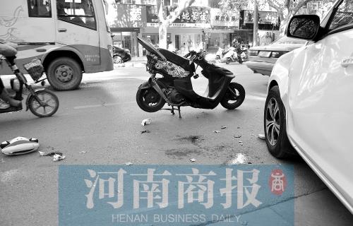 昨天中午12时许,郑州市黄河路与经六路交叉口,一辆在机动车道疾驰的摩托车与一辆待转入主道的轿车相撞。摩托车严重变形,现场还留下斑斑血迹。