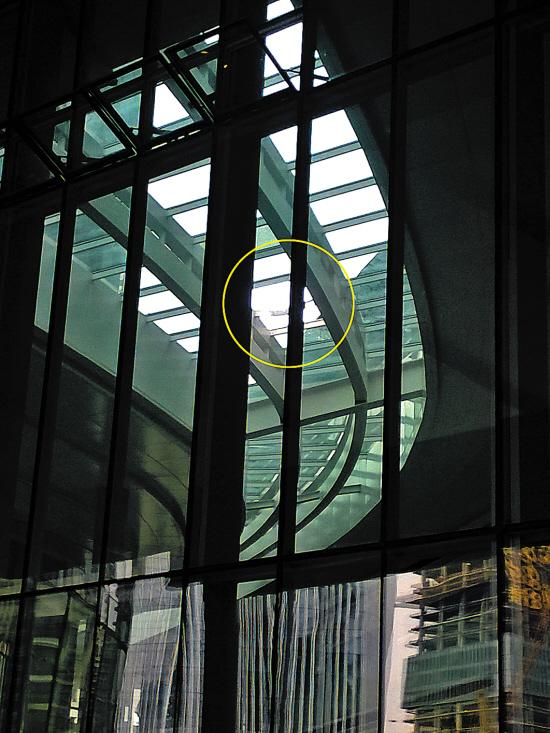 羊城晚报记者昨日中午来到国际金融中心,发现安保明显比平日有所加强。平日可供人员进出的停车场和国际金融中心主楼间通道被关闭,所有人员需要经户外大门进入国际金融中心内部;原本可自由出入的1楼大堂,在17日中午,所有到访者都须经保安确认后才能进入。在国际金融中心1楼大堂北面,靠近友谊商店一侧,此处保安特别严密。记者看到该处大堂,被一组宣传画围蔽,这组宣传画顶上的大堂玻璃幕顶,其中一块玻璃缺失,且中间的金属窗框弯曲,有被砸过的痕迹(见右图)。据国际金融中心内相关知情人士称,高处坠落的男子,其遗体在记者到访时,仍被围蔽在宣传画内。