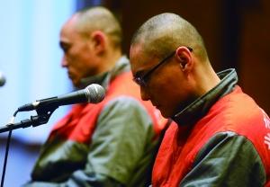 昨日,上诉人韩磊(右)在法庭上。 新华社发
