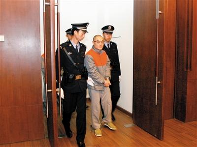 韩磊被带入法庭。昨日,大兴摔童案在北京高院二审开庭。