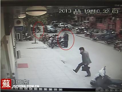 窃贼(左上)骑车逃离 保安(右下)迅速开车追赶