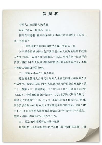 答辩状称,对于刘家要求县政府公开其计划外生育女儿被送的地址和收养人及生活状况,安新县政府称,并未掌握这一信息,更没有制作过这样的信息,不属于答辩人信息公开的范畴。