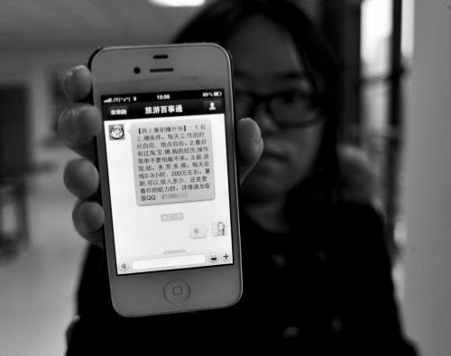 小姜告诉记者,11月19日,她接到一个名为“旅游百事通”的公众微信账号发来的信息,信息的内容是推荐网上兼职的工作,信息称,只要有上网条件,有网购经验就能操作,每天工作时间自由,地点自由,薪酬现结,每天在线两三个小时,就能获得200元左右的报酬,在信息的最后留了一个QQ号。