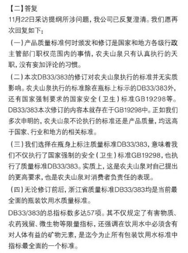 中新网11月25日电 农夫山泉今天在其官方微博回复京华时报11月22日的问题。并称,若京华时报仍有疑问,农夫山泉愿于本月29日(本周五)上午9时,在北京市朝阳区人民法院,农夫山泉诉京华时报社侵犯名誉权纠纷案的庭审现场,当庭回复。