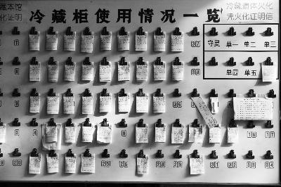 在殡仪馆冷藏柜使用一览的记事板中,共有85个小夹子,每个夹子代表一个冷藏柜,夹子下留存有信息卡的就代表该遗体还未火化,柴玉吉老人的信息卡就在其中。