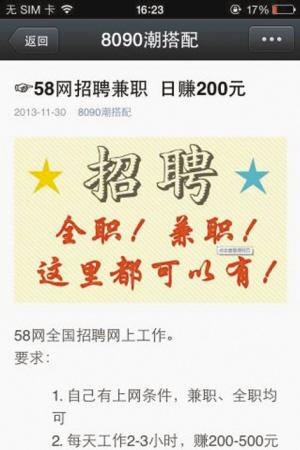 12月1日晚,她躺在宿舍里玩手机微信,她关注的一个名为80、90潮搭的公共账号突然发来一条消息,内容是帮助网店刷信誉就能赚钱,崔同学很心动。