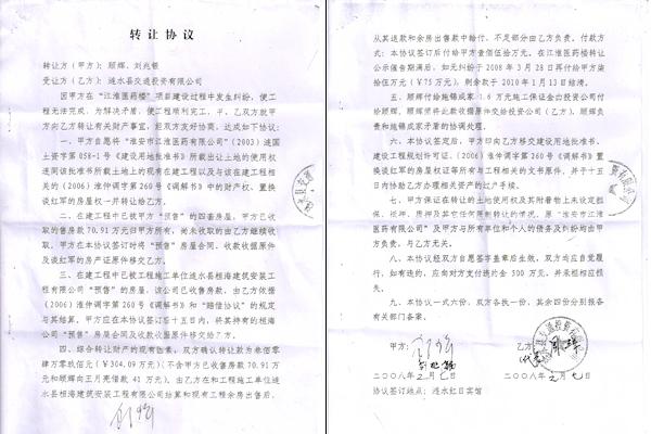 已被关押了60余天的顾辉,“自愿”与涟水县交通投资公司签订了财产《转让协议》,协议规定给顾辉304万元,“涟水县交通投资公司”取得的该块土地的使用权连同该块土地上的在建工程的产权归交通投资公司所有。2008年8月26日,受让单位“涟水县交通投资公司”委托安东拍卖公司以“门面房”在《扬子晚报》刊登公告,以每平方米10000元的起拍价拍卖。如今,这栋10500㎡的“医药综合楼”价值早已过亿。