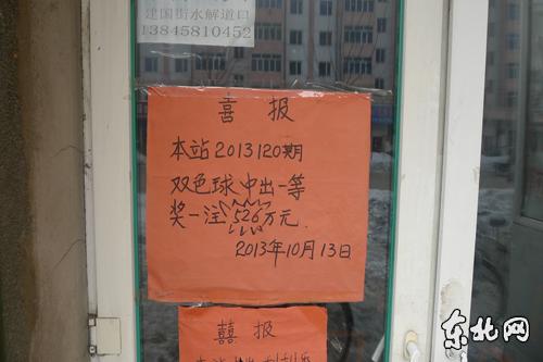 彩票站门前张贴的喜报。东北网记者 马冀 摄