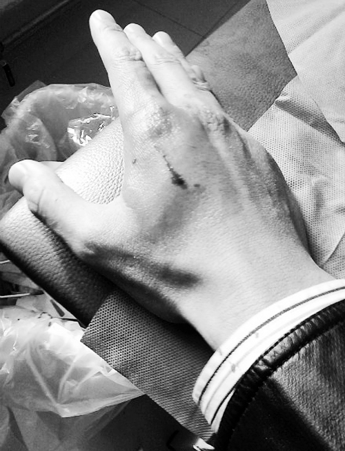 “我试图保护包,他的几个同事也过来撕扯。边撕扯我边退,我双手都抓在包上,这时司海军在我右手背上咬了一口,流血了。”王磊说。