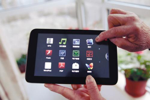 昨天,记者摁下“平板电脑”的开关按钮,显示屏上出现一个界面,上面有上网、聊天、图片、动画等图标,但无论触摸图标还是滑动页面,“平板电脑”都没有丝毫反应。可以说,这个“平板电脑”里,只有这一张带图标的图片。