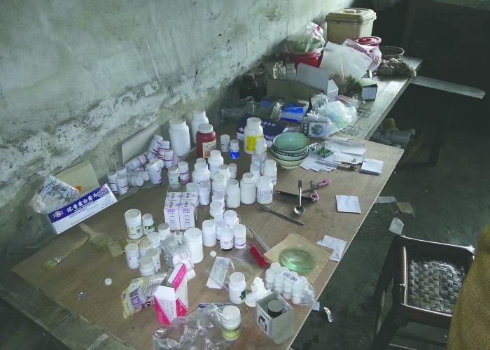 11月29日,稽查总队和市公安局对该诊所进行了联合行动,突击检查了这家诊所。在这家诊所的三楼,执法人员发现了研磨器械、毛刷子、勺子等,还查获了大量西药、药瓶以及没来得及丢弃的小包药粉。有的白色纸包上写着“痛风”二字。打开一些小的白纸包,里面是一些黑灰色药粉。