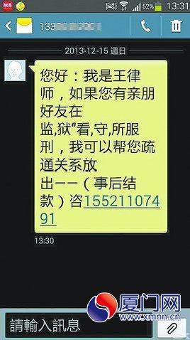 身在广州却能管到厦门的事,还可凭借“里面有人”,把犯人从看守所里“捞出来”?近日,一条这样的短信被发到市民的手机中:“你好,我是王律师,如果你有亲朋好友在监狱、看守所里服刑,我可以帮你疏通关系把人放出来。”不少接到短信的市民不禁直呼,“真是遇上史上‘管得最宽’、最‘神通广大’的骗子。”
