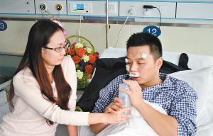 昨日中午,记者在西京医院急诊科见到了29岁的轩浩,他的爱人小许正坐在轩浩身边给他喂水。