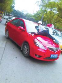 协警罗程被顶在车辆引擎盖上。图据网络