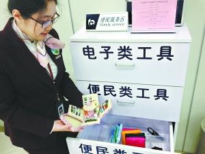 昨天下午,记者走进交行中轴路支行,两位员工微笑迎上,热情地询问是否需要帮助。门内右侧的墙上挂着一张“关爱老年客户服务流程”表框,下面放着一辆轮椅、一个便民工具柜,打开柜子的抽屉,里面有验钞灯、助听器、放大镜、老花镜、便笺本、针线包、打气筒、充电器等各种工具。大厅入口处放着一台叫号机,与常见的叫号机不同,这台叫号机屏幕上多了一个“老年客户爱心窗口”按钮,记者看到,只要是老年客户进来,工作人员就会帮他们按下这个按钮,并引导老人到2号“爱心窗口”。而在这个窗口前,不仅放着一把挂账,还有一个精美的收纳盒,里面放着呼叫铃、便笺本、放大镜、老花镜等小工具。