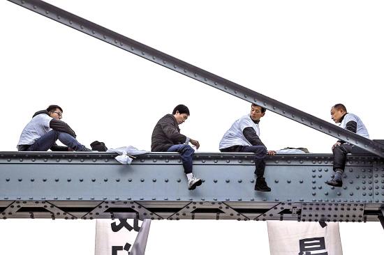 24日16时许,4名男子爬上海珠桥(见上图,周巍摄,资料图片),并在桥上挂出2条横幅反映诉求。接群众报警后,广州警方迅速派出消防、交警、水警,以及越秀区公安分局民警到场处置,对4名男子展开劝说工作。23时30分许,4名男子自行下桥,随后被警方带回作进一步调查。此事造成海珠桥附近路段交通拥堵长达7个小时。