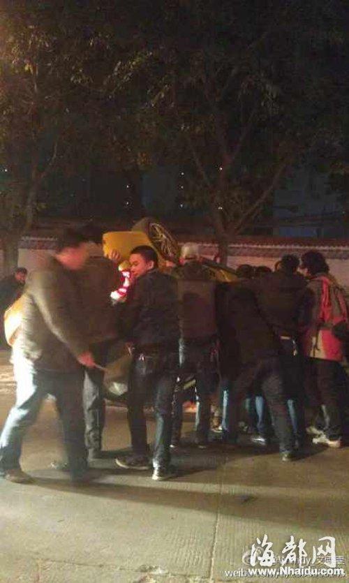 出租车疑因远光灯晃眼翻车 乘客的哥被压车底(图)