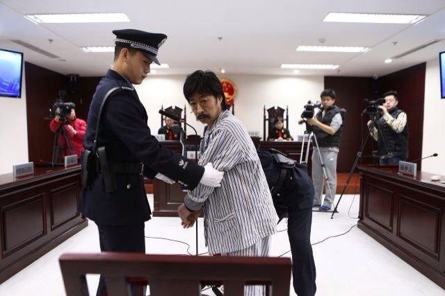 法警将犯罪嫌疑人押上法庭。新京报记者 周岗峰 摄