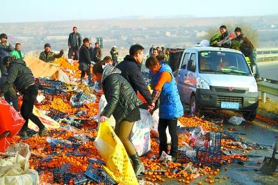 2013年11月15日,兰州中川机场高速茅茨互通立交桥上,一辆货车侧翻,橘子散落,附近多个村庄的村民“闻风而动”,手持各种家什前来哄抢橘子……