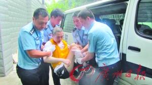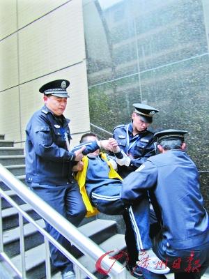 广州中院的法警抬着一名腿脚不便的被告人出庭。