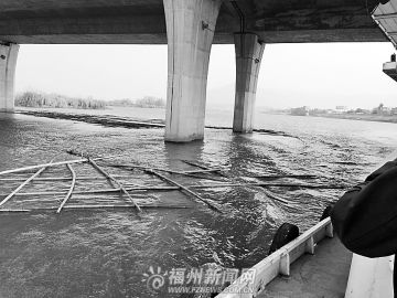 记者随后将现场了解到的情况反馈给闽侯县砂石办郑主任。昨日中午,记者跟随执法队伍一起前往六十份村。谁知执法艇刚行驶至湾边大桥下,就被一大片漂浮的竹竿挡住了去路。执法人员发现这些竹竿不是散落在江面上,而是别人蓄意用铁丝扎成的竹排,这些竹排还和桥墩绑在一起,宽约6米,长度覆盖了港湾的入口。这明显是非法采砂人员蓄意设置的障碍,为自己沉船争取时间。