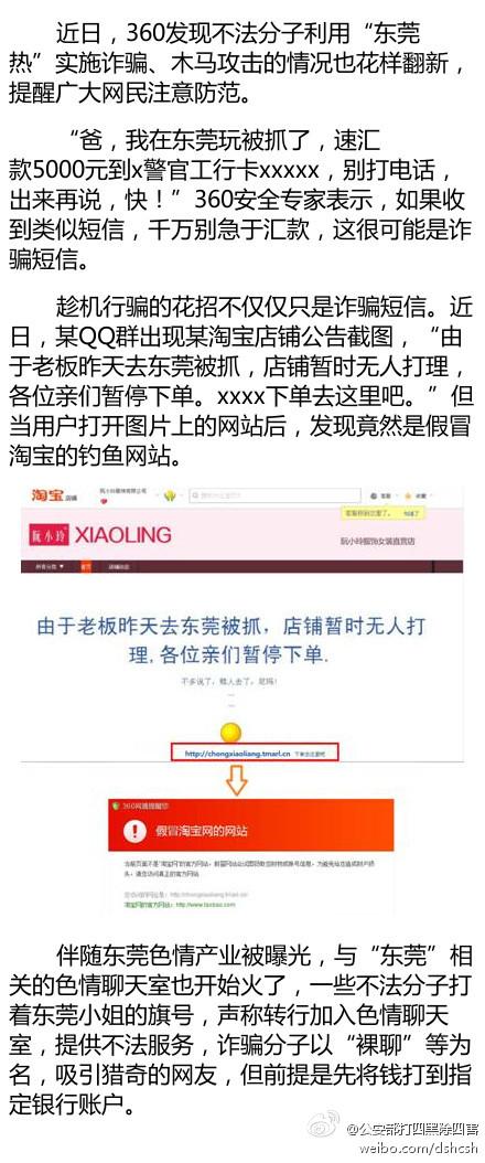 公安部治安管理局、公安部“打四黑除四害”专项行动办公室官方微博“公安部打四黑除四害”提示:“爸,我在东莞晚上玩被抓,速汇5000元到X警官工行卡XX……,别打电话,出来再说,快!”收到类似短信千万别汇款,这是诈骗短信。近日,有些不法分子利用“东莞热”实施诈骗,类似招数还有淘宝店主被抓、东莞小姐进聊天室裸聊等。(记者孝金波)戳图↓别上当!