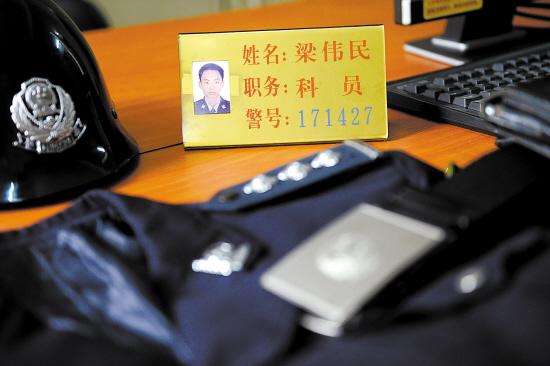 梁伟民生前用过的办公桌上放着他的警号牌与衣物 羊城晚报记者 汤铭明 摄