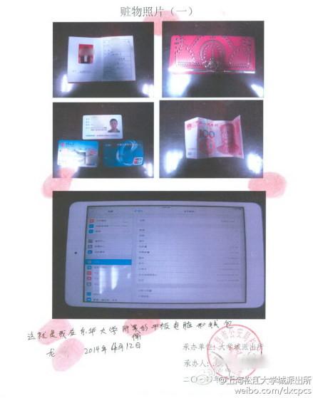记者看到,警方寻获的物品包括身份证、银行卡、钱包、百元大钞以及平板电脑,而这些都是男子在东华大学和华东政法大学的教室内“拿”走的。