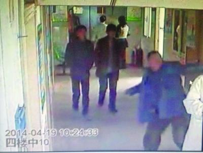 视频显示,19日上午10:23:00,三名男子出现在监控视频中,其中一名稍胖的男子右手放在耳边打着电话,其余两人手插在上衣的口袋内。在快到四楼妇产科医生办公室门前时,三人停住了脚步,打电话的男子放下电话,三人交谈了几句。随后,打电话的男子继续打着电话,三人走到医生办公室门前,向里面张望了一下,打电话的男子依然在打着电话,另外一名男子向里面看了一下,走开了,在门口转悠起来。