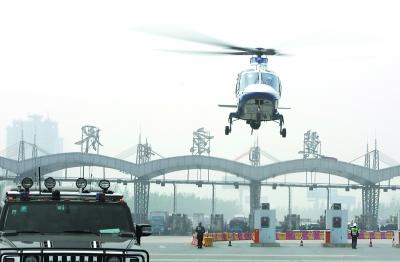 今天演习的是“反劫持”,10点30分,天津的一名恐怖分子劫持了一辆白色大众轿车,打伤女司机后向北京驶来。警用直升机沿京开高速上空飞近,不停向地面通报大众轿车的情况,地面上,三辆警车埋伏在固安收费口,当歹徒闯关时,同时冲上,堵住轿车,抓住罪犯,直升机将受伤的女司机载走救治。