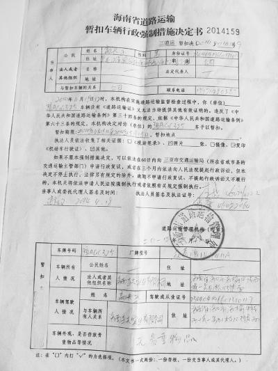 “我立即把驾驶证给了他们。”高先生说,对方检查完驾驶证后,又去询问客人。客人也明确回应了酒店是免费提供接送服务的,但其中一名工作人员竟把车辆暂时扣留,并问高先生有没有在运管处备案。“随后,对方给我开具了两张海南省道路运输暂扣车辆行政强制措施决定书,让我在1个月内等待交通局的处理结果。”