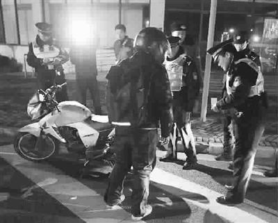 图为钦州南路虹漕南路口,民警检查一辆疑似非法改装的大功率摩托车