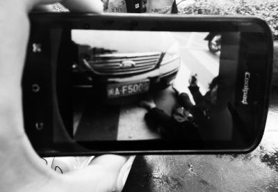 余方丈夫用手机拍下了自己妻子与一辆车牌号为闽AF5008的小车相撞后的现场