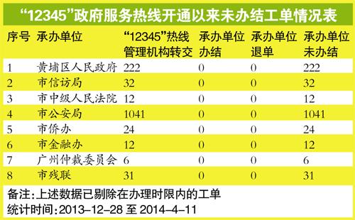 2013年12月广州“12345”政府服务热线开通以来,大部分承办单位能按要求办理热线管理机构转办的工单,及时回复群众,但也存在个别单位工单积压问题。曝光台晒出“12345”政府服务热线开通以来,承办单位未办结工单情况信息表,并提出“相关单位的主要领导、分管领导知道这些情况吗”的问题。