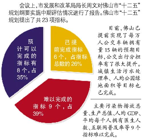 昨日,佛山市第十四届人大常委会第十八次会议召开。会议审议通过了佛山市实施行政处罚情况的报告和关于佛山“十二五”规划纲要实施中期评估的报告。根据佛山“十二五”规划实施进度,预计将有9个指标难以完成。主要涉及主要污染物排放总量、生产总值、人均GDP、平均每千人拥有医生人数和互联网普及率等。