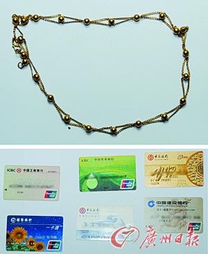 警方收缴的被害人项链和银行卡。记者邵权达 摄