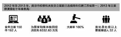 2012年至2013年,南京市检察机关反贪立案数已连续两年位居江苏省第一,2013年立案数更是创十年来新高:全年立案150件192人,为国家和集体挽回经济损失6332.63万元,大案率100%,查处县处级以上要案嫌疑人32人。
