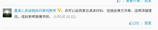 5月5日零时,最高人民法院执行局刘贵祥回复该条微博称:“你可以给我寄份具体材料,包括法律文书等,说明详细情况。信封表明微博字样。 ”