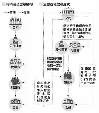 2011年7月间,犯罪嫌疑人姚建清在福建省建瓯市设立了建瓯市百分百电子商务有限公司(以下简称百分百公司),其为股东及法人代表,聘用犯罪嫌疑人朱剑等网络技术人员,设计制作“百分百返利网站”,并在互联网上运营,该网站以“购物返利”的形式,前期按公司→总代理商→代理商→加盟商→会员,后期按公司→代理商→加盟商→会员的层级结构开展传销活动,具体体现为:公司通过网站、广告等宣传方式,向下按县级区招募总代理商、代理商,承诺给予代理商会员购物消费金额2%的佣金,经公司扣税后,佣金实为1.6%。而后由总代理商、代理商向下发展加盟商,加盟商再发展会员到“百分百返利网站”消费,会员购买商品时另向公司支付消费金额16%的返利保证金,百分百公司将在500日内每日按消费金额的0.2%向会员支付返利,向百分百公司推荐会员的加盟商可按照消费金额收取一定比例的佣金。