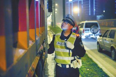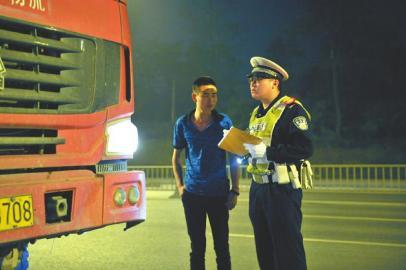 4月22日,七分局交警赵苏在夜间对运渣车进行检查。