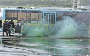 10时30分,随着对讲机传来指挥中心“公交车发现劫匪!歹徒和人质人数不详”指令的瞬间,“反恐”队员已从最近地点赶到事发地点。由于暴雨,能见度差,公交车上的情况尚不清晰,只是不断听到有歹徒劫持人质的动静。一声“强攻”指令,“反恐”队员借助一根约有五六米长的竿子如离弦之箭吸附在事发公交车上。接下来的动作,几乎以迅雷不及掩耳之势——橡胶炸弹爆破声起,作案公交车中后部大块玻璃碎了一地。伴着巨大的爆炸声,特警队员进入车内,枪响人倒,一小队队员潜入拖走“被击毙暴徒”。