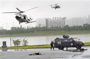 深圳警方暴雨中反恐演练 陆空联动击毙“公交劫匪”