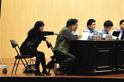 受害者母亲(左一)手指着被告人,大声质问。昨天,歌厅群殴致人死亡案在市三中院开庭审理,17名被告人分别被控故意伤害罪及聚众斗殴罪。新京报记者 周岗峰 摄