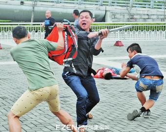 昨日上午,福州警方在火车南站站前广场组织了一场“反暴恐”模拟实战演练。