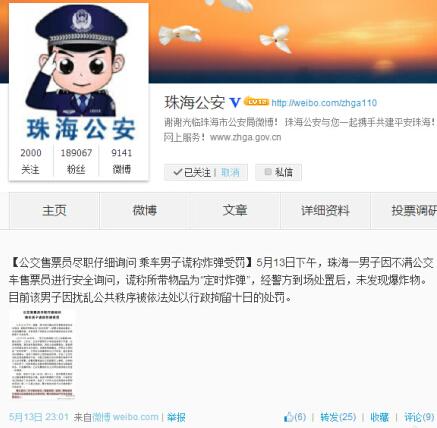 据广东珠海市公安局通报,5月13日下午,珠海一男子因不满公交车售票员进行安全询问,谎称所带物品为“定时炸弹”,经警方到场处置后,未发现爆炸物。目前该男子因扰乱公共秩序被依法处以行政拘留十日的处罚。