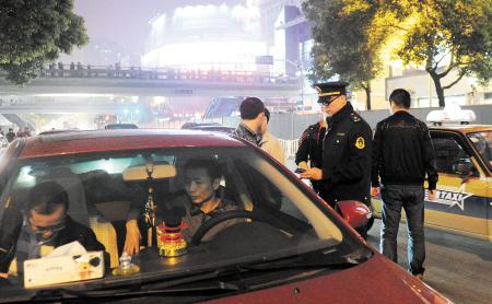 市交通行政执法队员在解放西路夜查黑车。余志雄 摄